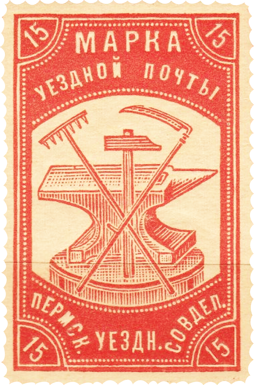 Марки Пермского Совдепа, выпущенные в середине 1918 года Советом депутатов Перми, отпечатаны на плотной бумаге, способом типографской печати с рельефным тиснением. На них изображены наковальня, молот, грабли и коса; номинал марок — 15 копеек.